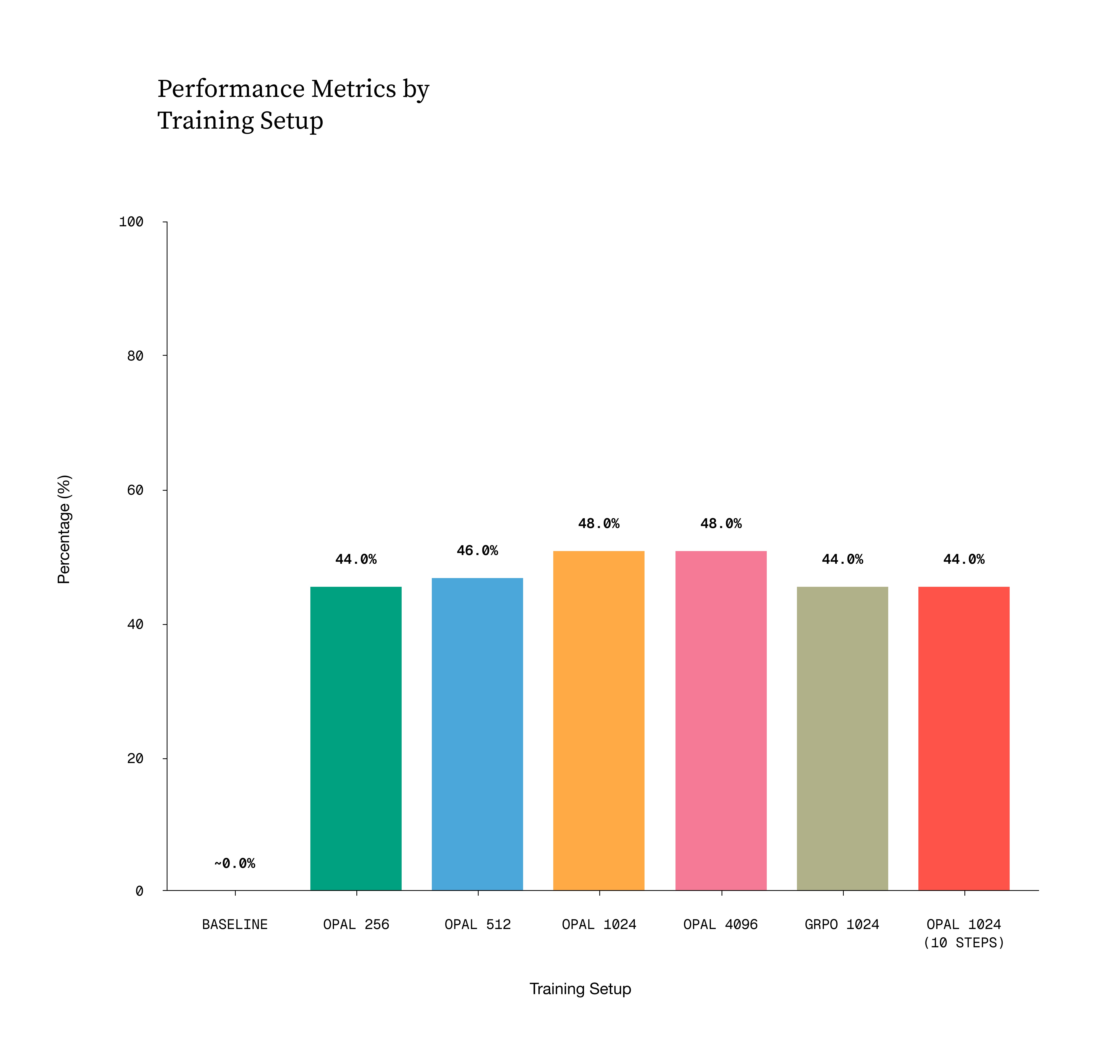 The matched one-step comparison with GRPO is encouraging but not decisive. OAPL landed at 48% end-to-end correctness, compared with 44% for GRPO. That slightly favors OAPL, but the held-out slice is small enough that we should be careful. The safer conclusion is that OAPL looks at least competitive on quality while fitting the batch-first workflow better.